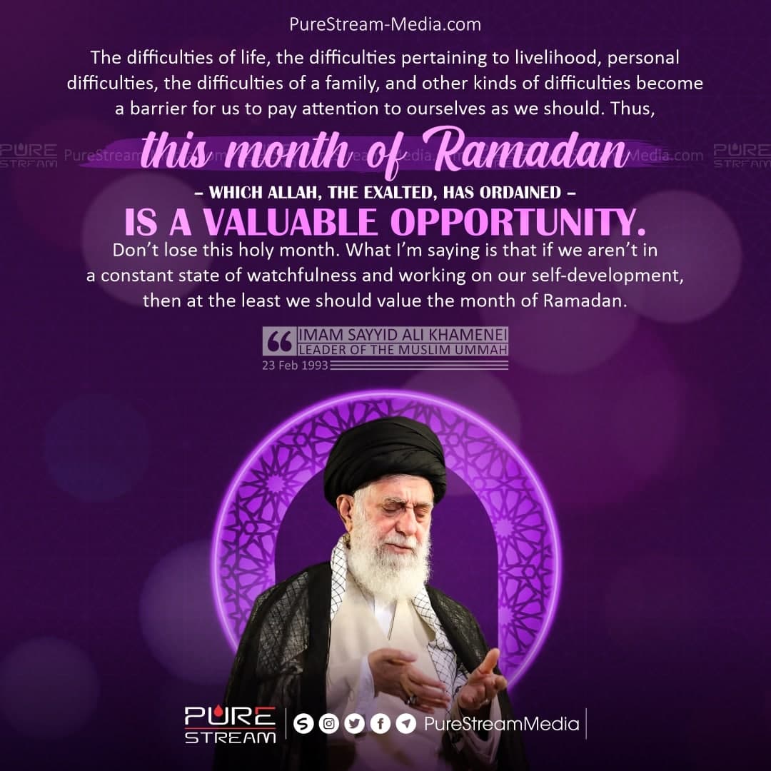 The difficulties of life, the difficulties pertaining to livelihood, personal difficulties, the difficulties of a family, and other kinds of difficulties become a barrier for us to pay attention to ourselves as we should. Thus, this month of Ramadan – which Allah, the Exalted, has ordained – is a valuable opportunity. Don’t lose this holy month. What I’m saying is that if we aren’t in a constant state of watchfulness and working on our self-development, then at the least we should value the month of Ramadan.