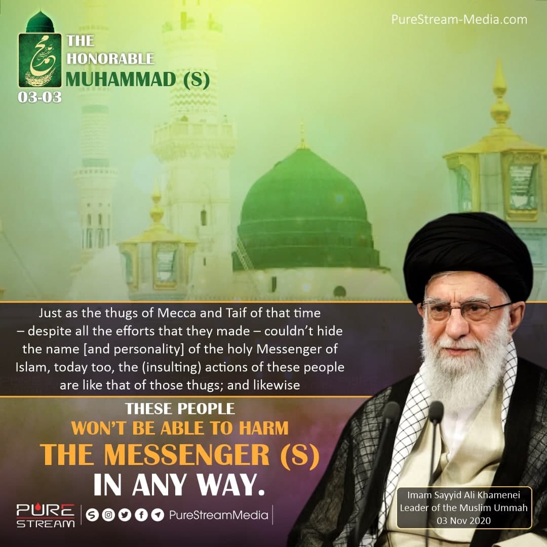 Just as the thugs of Mecca and Taif of that time – despite all the efforts that they made – couldn’t hide the name [and personality] of the holy Messenger of Islam, today too, the (insulting) actions of these people are like that of those thugs; and likewise these people won’t be able to harm the Messenger (S) in any way.